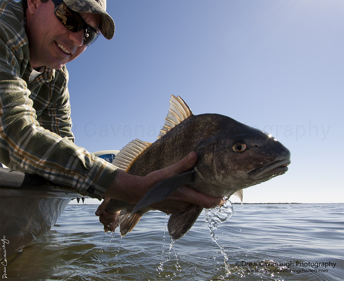 drum have been just out of control here as well. Follow this link to a YouTube video I made earlier this month with Martin, from the UK, getting some fabulous shots at tailing black drum. As the next few weeks go on we should stay steady on this path, great fishing all over! Give me a call and let's get you into some of the greatest action the area has to offer. I made earlier this month with Martin from the UK getting some fabulous shots at tailing black drum. We got these on artificial. The best thing was and is, I am finding these fish daily still! The numbers we are getting on charters are fulfilling, and quality fish. All between 4 to 12 pounds. Targeting them at first light and at dusk if able tends to be the best tactic. Using mainly for the fly angler, a small black fly on a 7 or 8 weight or as always a shrimp pattern will not steer you wrong.